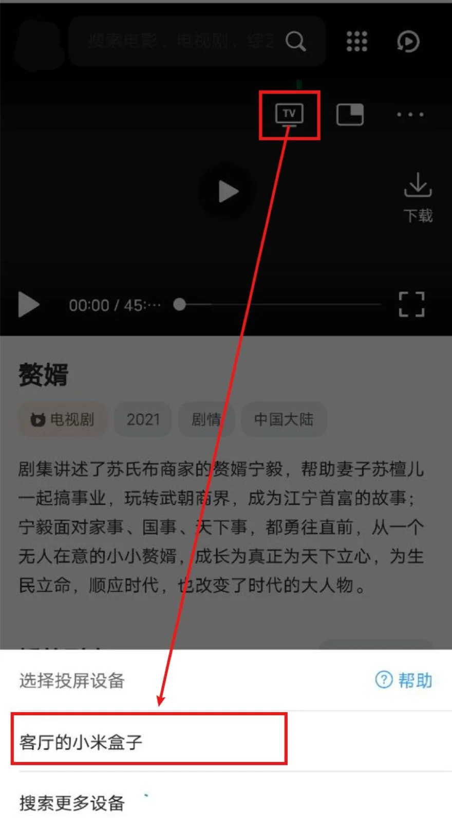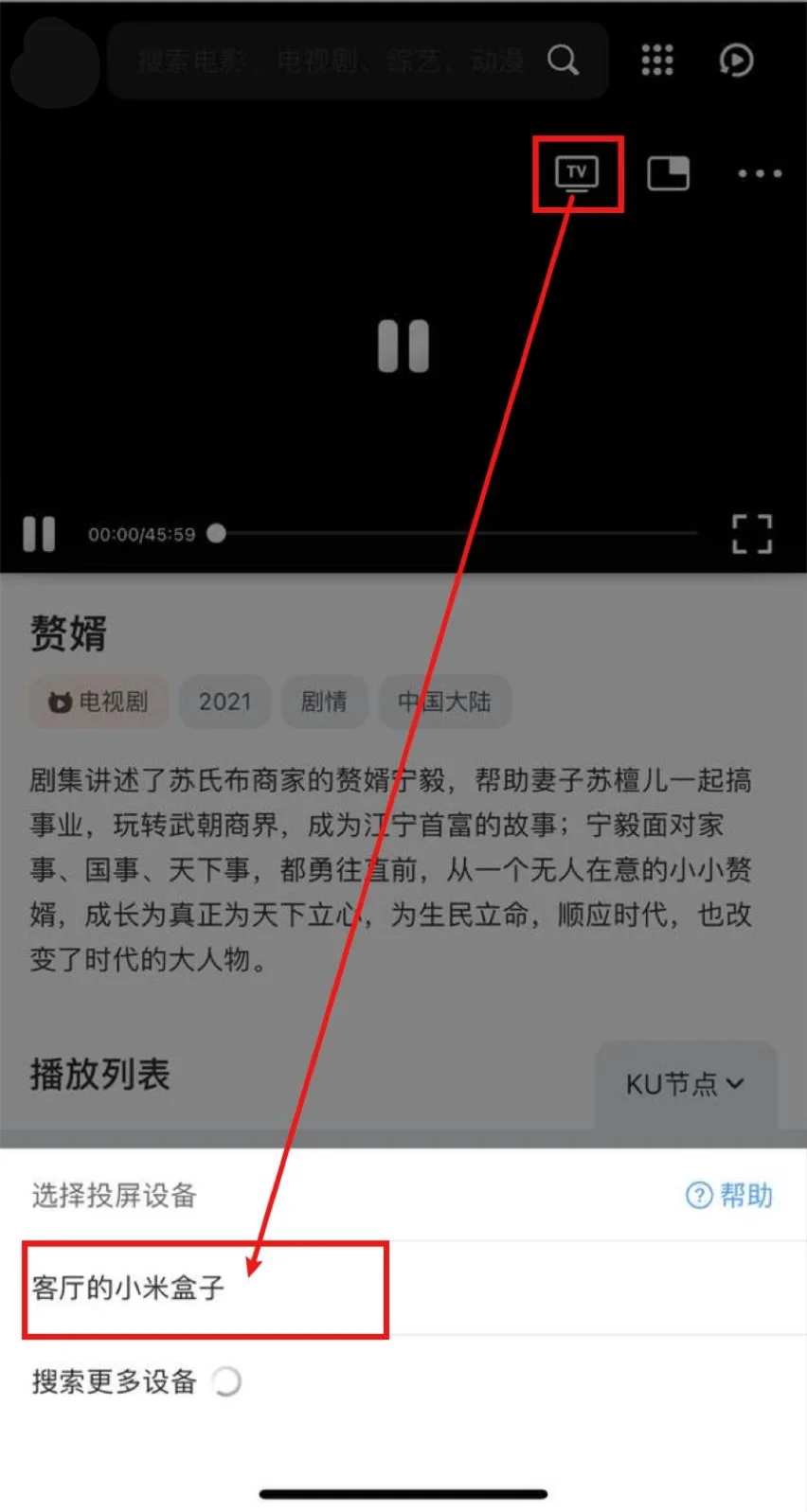 打开QQ浏览器(会接管网页播放器)->打开牛马TV->播放视频->选中投屏图标->等待搜寻出智能电视/电视盒子->选中,即可投屏。